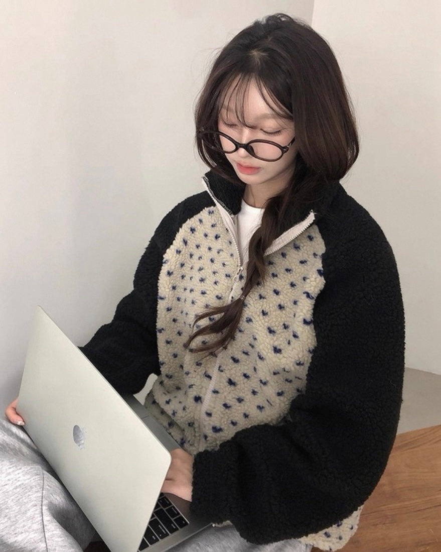心形波點拼色搖粒絨外套 Heart-Shaped Polka Dot Color-Block Fleece Jacket